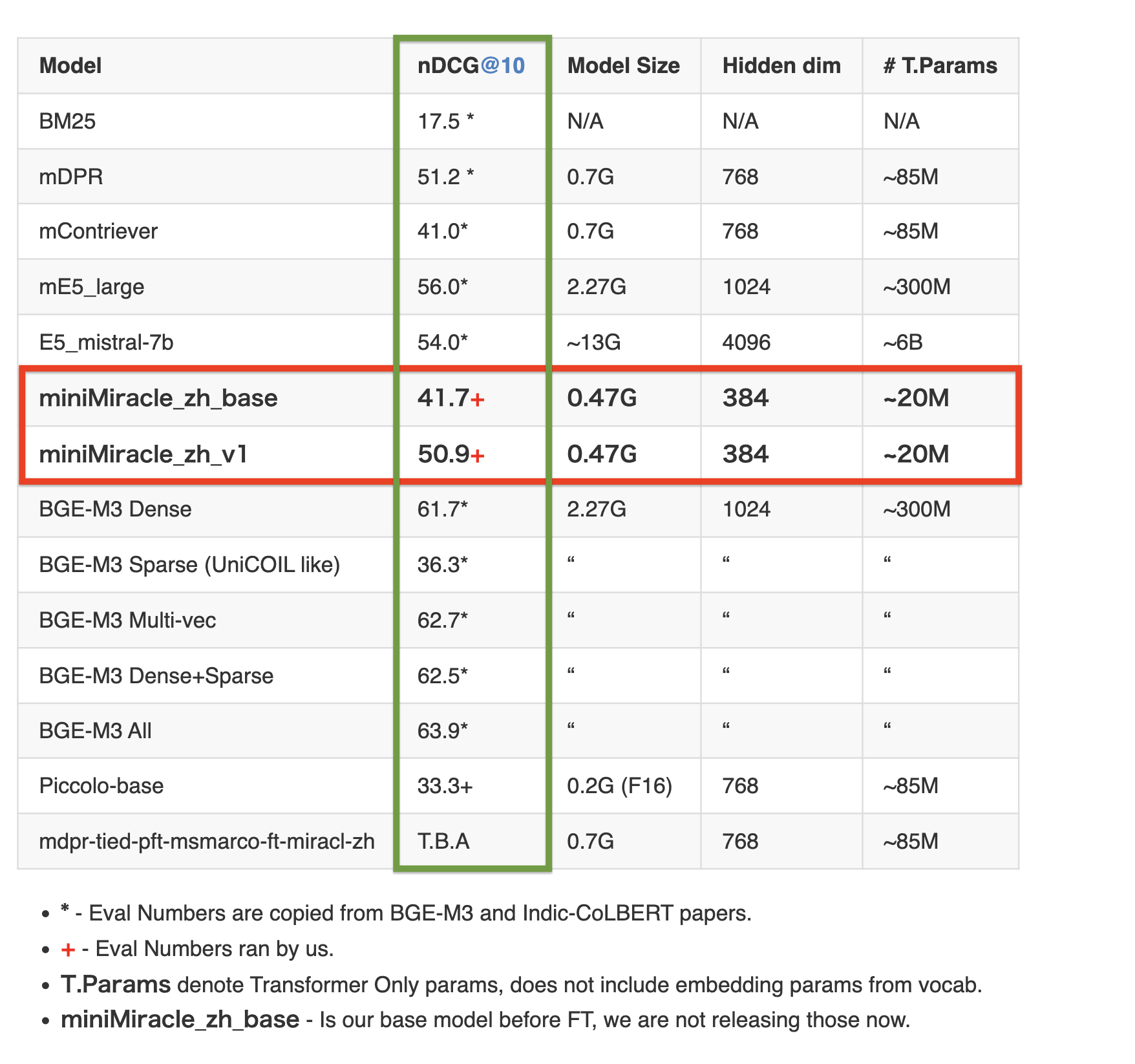 Table 1: Chinese retrieval performance on the MIRACL dev set (measured by nDCG@10)