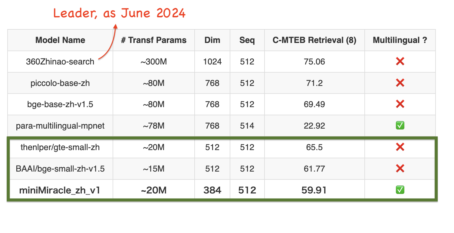 CMTEB is a general purpose embedding evaluation benchmark covering wide range of tasks, but like BGE-M3, miniMiracle models are predominantly tuned for retireval tasks aimed at search & IR based usecases. We ran the retrieval slice of the cMTEB.